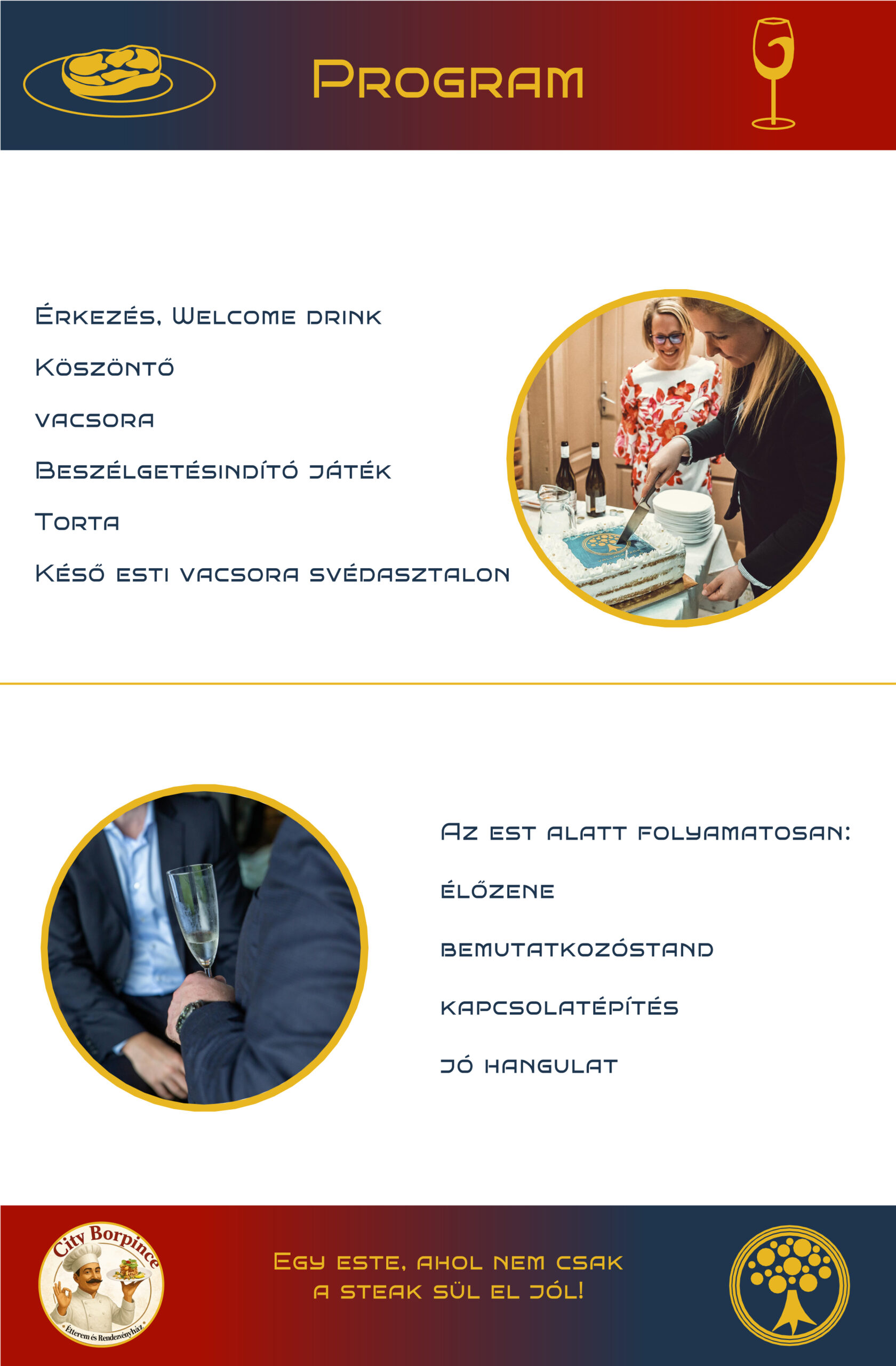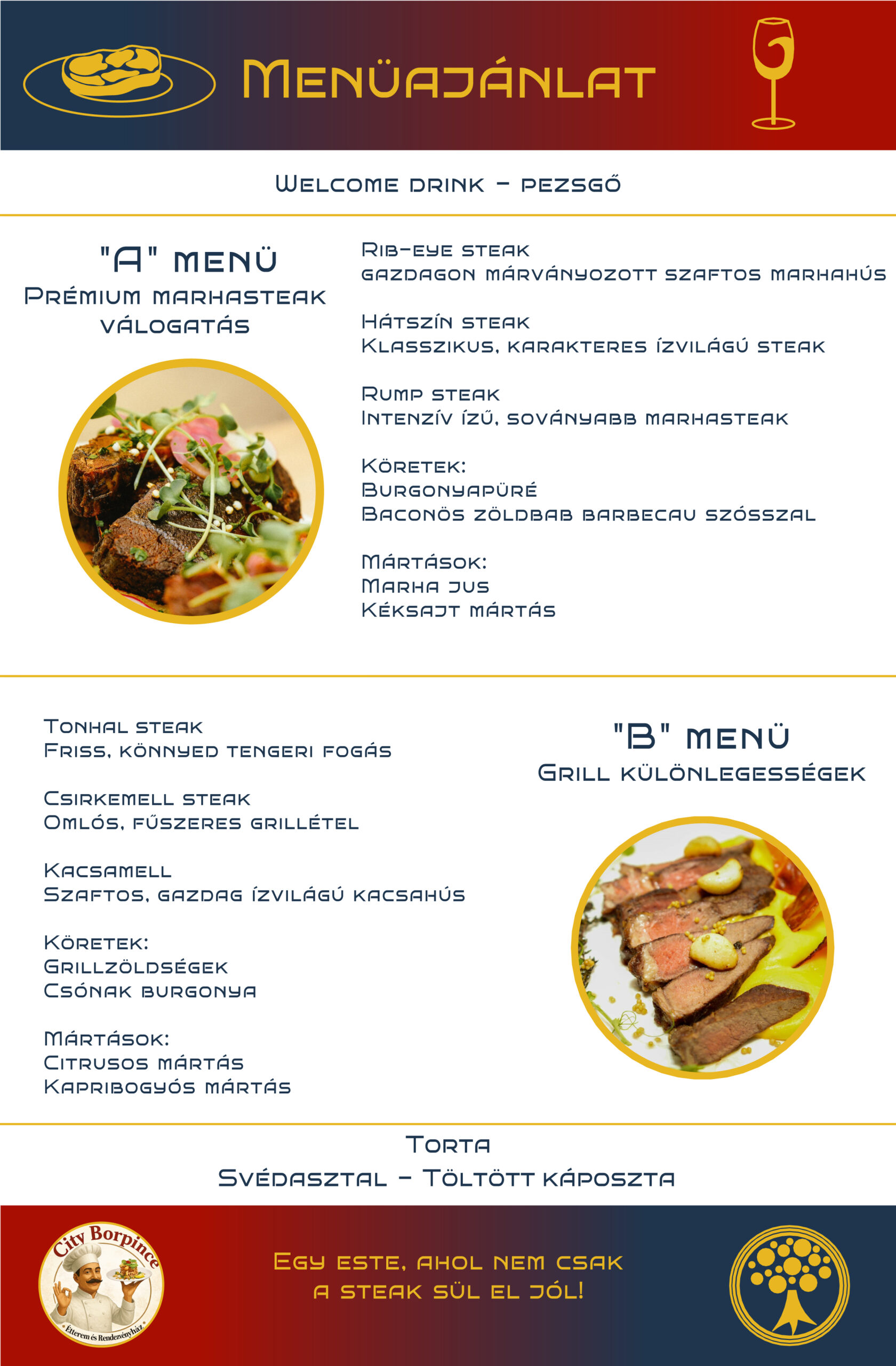 Welcome drink – Élőzene – Steak különlegességek – Torta